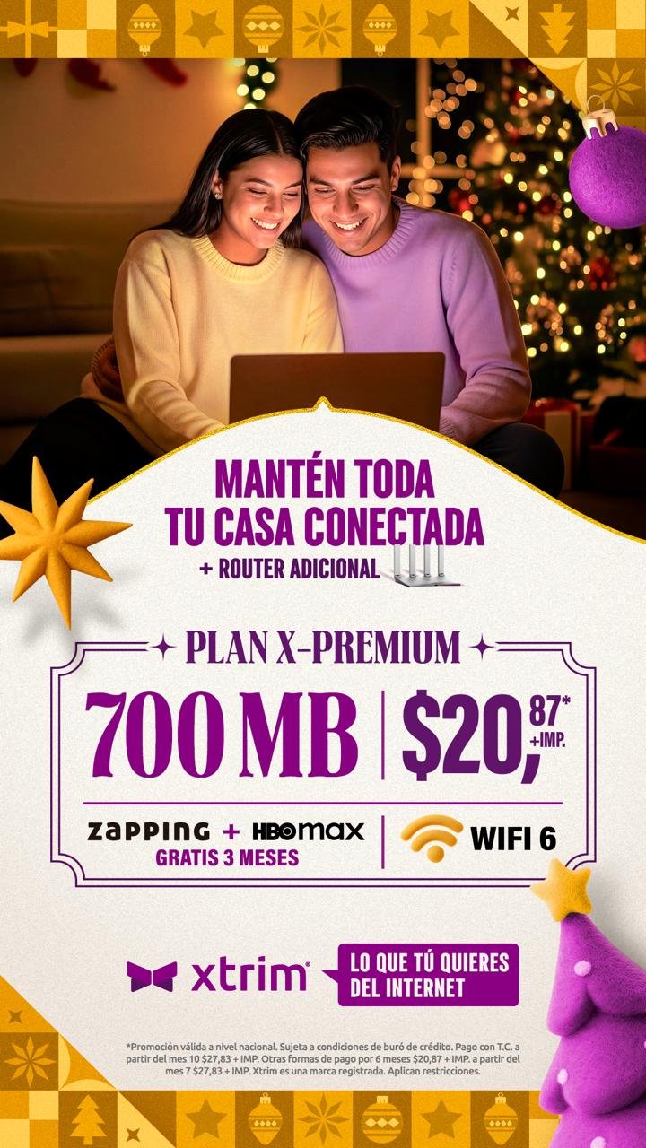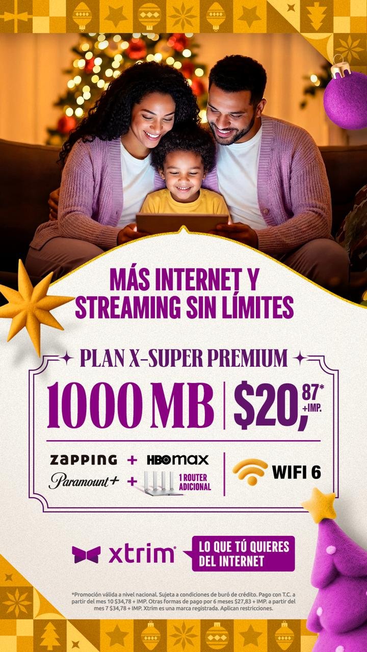 INTERNET 100% FIBRA OPTICA Cámbiate a Xtrim el Internet que te incluye el Futbol Conoce nuestros Planes de Internet y Entretenimiento Xtrim ofrece internet fijo de alta velocidad con fiabilidad y atención personalizada para conectar mejor PLANES DE DESDE 15,64 MAS IMP. MAS INFORMACION AQUI LA MEJOR EXPERIENCIA EN INTERNET Internet súper rápido Gracias a nuestra red 100% fibra óptica hasta tu hogar CLIENTES NUEVOS 65/100 CLIENTES SATISFECHOS 95/100 MEJOR PRECIO VALOR 80/100 MAS INFORMACION AQUI EL MEJOR PLAN DE INTERNET 1000 MEGAS MAS CANALES y todo el entretenimiento en Hd por solo 24$ MAS INFORMACION AQUI